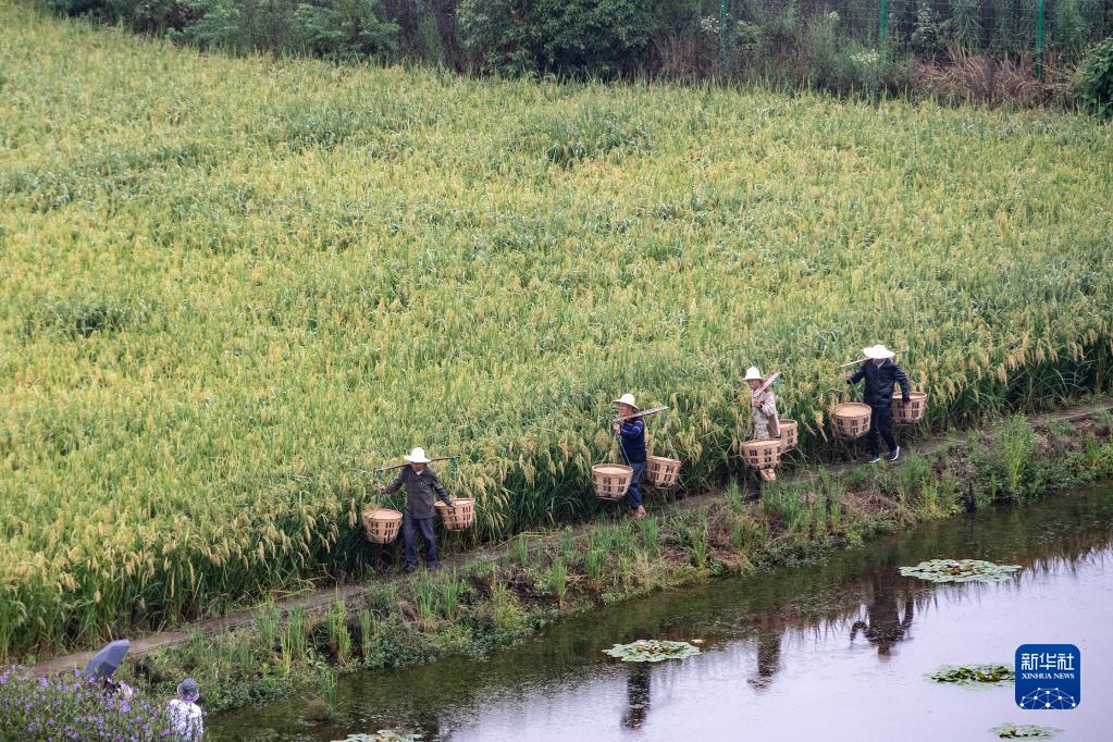 近日,重慶市大足區拾萬(wàn)鎮長(cháng)虹村隆平五彩田園豐收在即,巨型稻田畫(huà)勾勒出金秋壯美景象,吸引眾多游客前來(lái)打卡游玩。