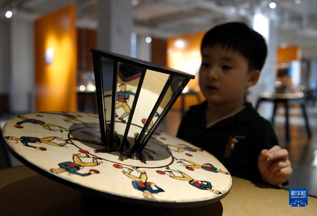 一位小朋友在西影電影藝術(shù)體驗中心參觀(guān)原始動(dòng)畫(huà)裝置“詭盤(pán)”(9月11日攝)。