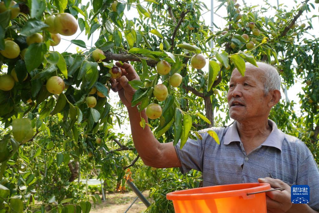9月22日,在山東省濱州市沾化區下洼鎮的大棚冬棗種植園,棗農在采摘成熟的冬棗。