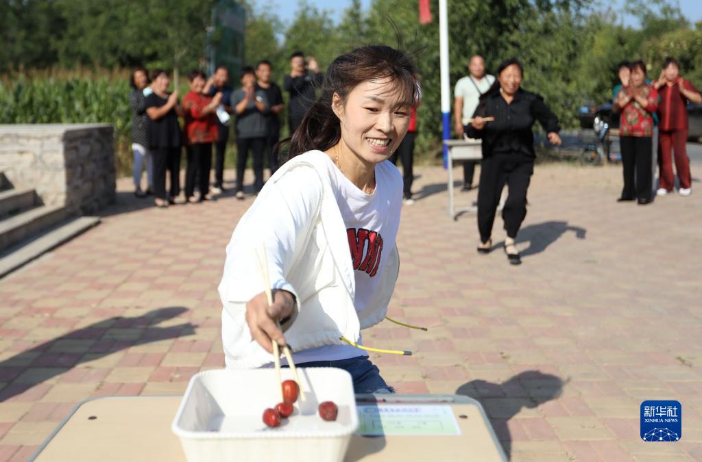 9月22日,河北省滄州市滄縣村民在進(jìn)行“筷子夾棗”比賽。