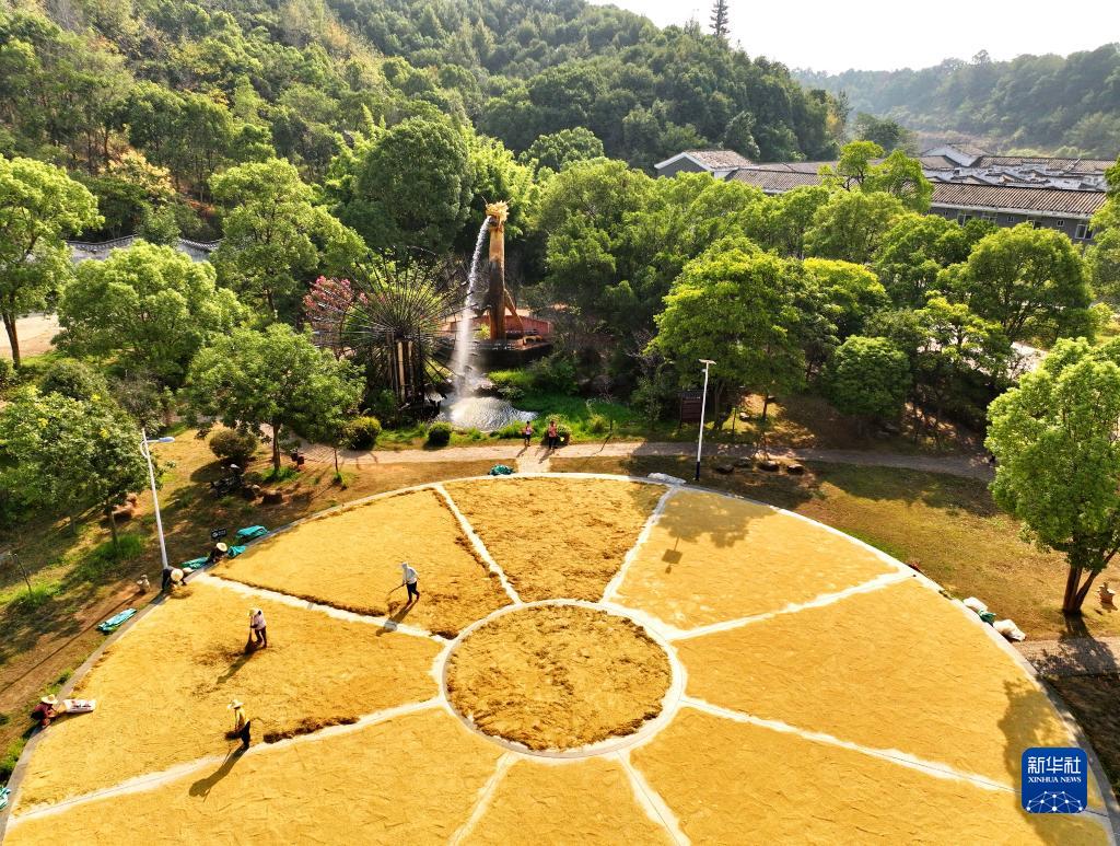 9月17日,在江西省贛州市章貢區沙河鎮五龍村,村民在廣場(chǎng)上晾曬稻谷(無(wú)人機照片)。