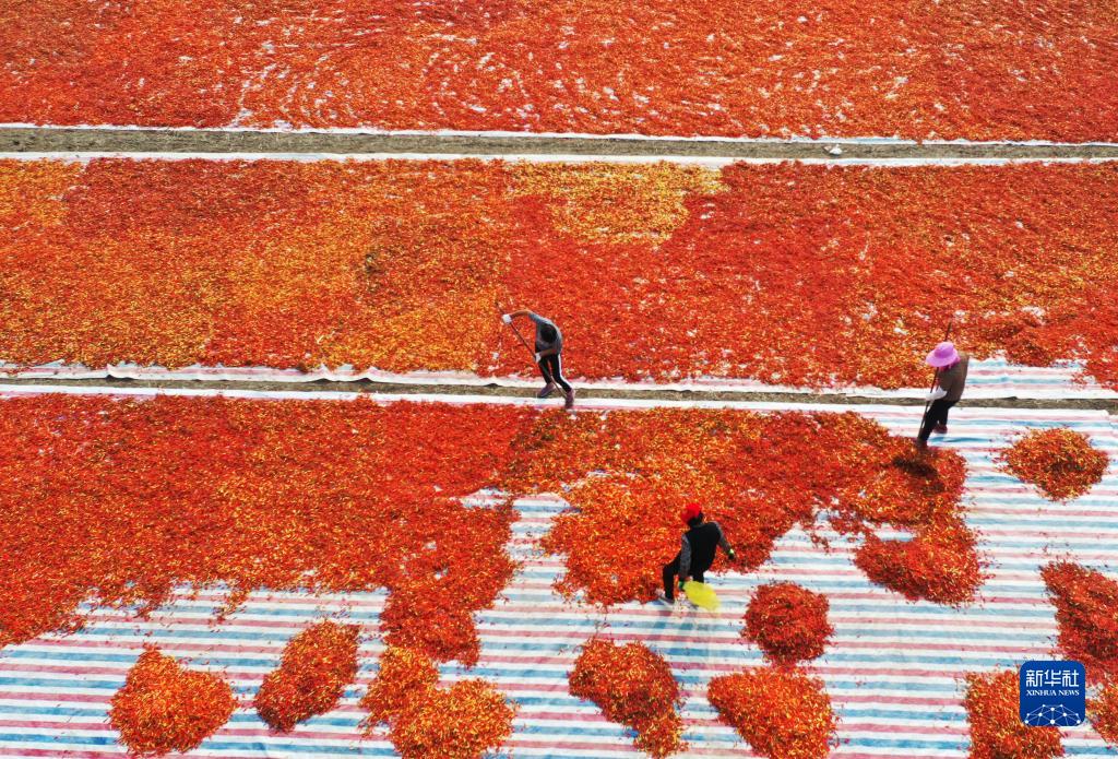 9月12日,安徽省亳州市譙城區古城鎮油河村村民在翻曬辣椒(無(wú)人機照片)。