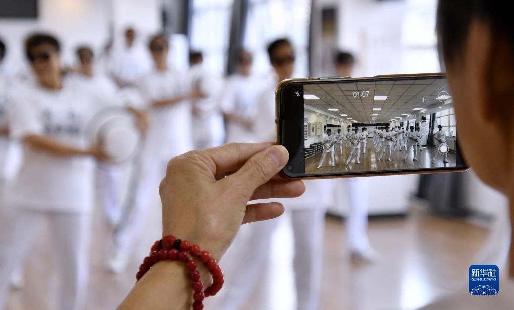 居民在北京市朝陽(yáng)區八里莊街道社區文化中心拍攝舞蹈排練(9月22日攝)。