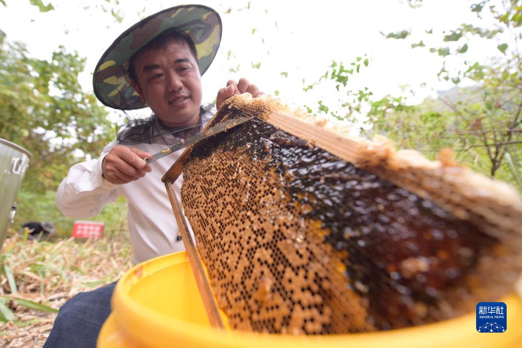 9月20日,在貴州省黔東南苗族侗族自治州岑鞏縣羊橋土家族鄉炮灣村中蜂養殖示范點(diǎn),“80后”袁治敏在采收蜂蜜。2017年,身患殘疾的袁治敏成立農民專(zhuān)業(yè)合作社從事中蜂養殖。今年他養殖的328箱中蜂迎來(lái)采蜜高峰期,預計收獲蜂蜜3000多斤。