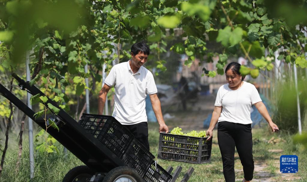9月16日,在河南省焦作市武陟縣圪垱店鎮馮村,“80后”崔小亮和妻子將采摘好的葡萄裝車(chē)。今年他們的葡萄產(chǎn)量預計達2萬(wàn)斤。