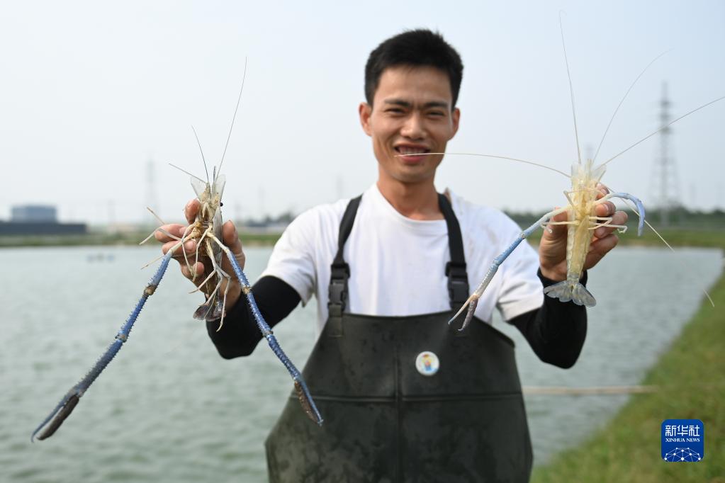 9月23日,豐盛灣水產(chǎn)養殖基地的工人展示捕獲的沼蝦。