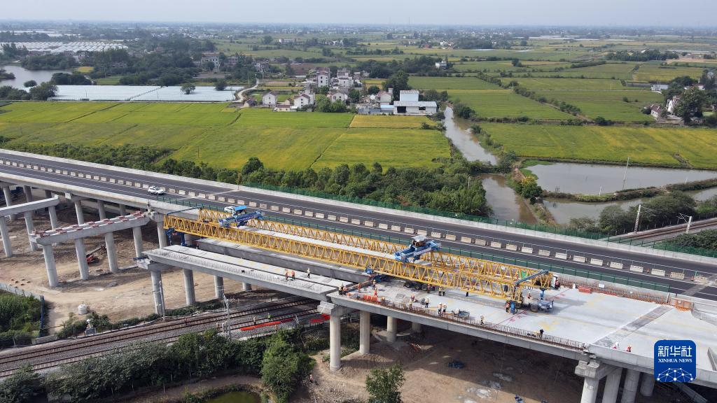 9月23日拍攝的蕪合高速公路上跨淮南鐵路箱梁架設施工現場(chǎng)(無(wú)人機照片)。