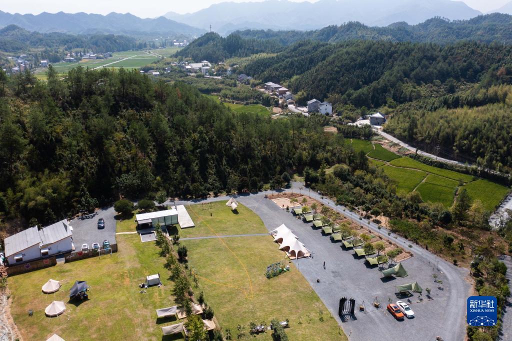 9月24日,空中俯瞰位于杭州市臨安區太陽(yáng)鎮上莊村的牧光谷露營(yíng)基地,該基地是2022年5月剛投入運營(yíng)的網(wǎng)紅露營(yíng)基地,帶動(dòng)周邊30余名農戶(hù)就業(yè)(無(wú)人機照片)。