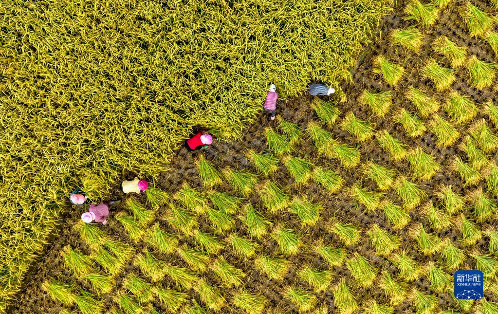 9月13日,在安徽合肥廬江縣白湖鎮省級現代農業(yè)示范基地,農民在田間收割水稻(無(wú)人機照片)。
