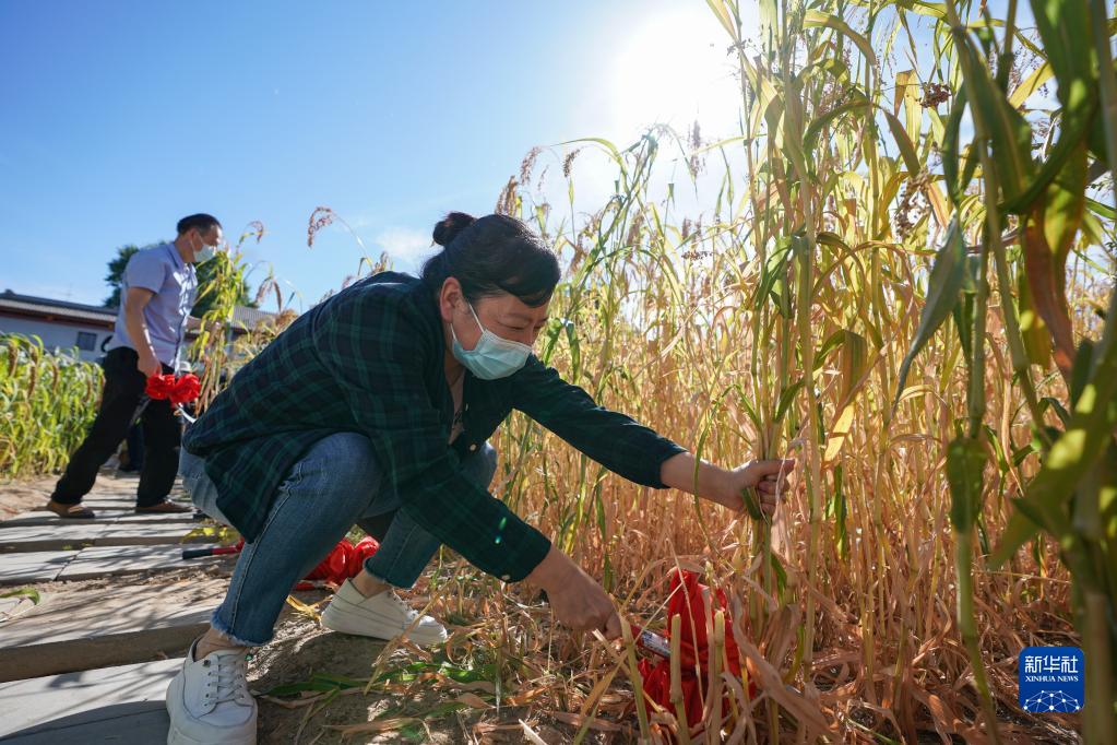 9月24日,秋收活動(dòng)參與者用鐮刀收割北京先農壇“明清耤田”里的黍。