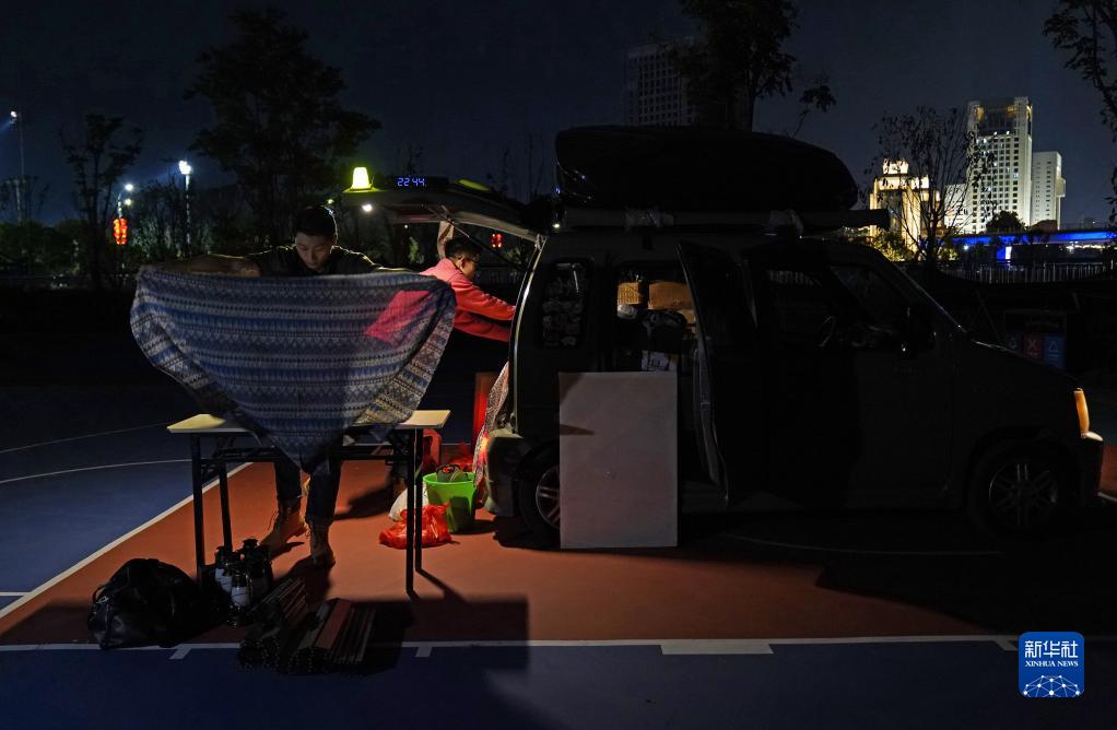 在南昌市紅谷灘區的一處空地,呂琦飛(左)開(kāi)始鋪設桌子(9月22日攝)。