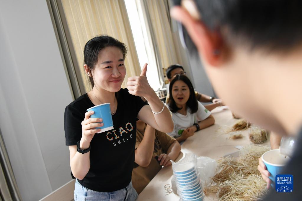 9月22日,在“無(wú)聲咖啡師”公益培訓課上,學(xué)員夸贊聽(tīng)障咖啡師周潔制作的咖啡。