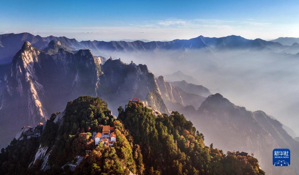 9月25日,夕陽(yáng)西下,雨后初霽的西岳華山,云霧縈繞,宛如仙境(無(wú)人機照片)。
