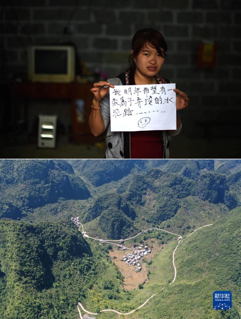 上圖:在廣西大化瑤族自治縣板升鄉弄勇村,村民藍春花展示村民們的“公路夢(mèng)”(2015年2月14日攝);下圖:如今的弄勇村已經(jīng)實(shí)現了屯屯通公路(2022年9月24日攝,無(wú)人機照片)(拼版照片)。