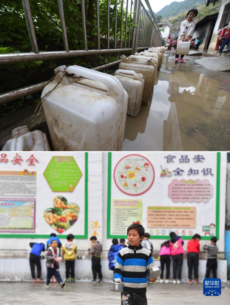 上圖:在廣西大化瑤族自治縣板升鄉八好小學(xué),同學(xué)們用儲備在水桶里的雨水淘米煮飯(2014年11月24日攝);下圖:同學(xué)們用自來(lái)水洗碗(2021年3月16日攝)。八好小學(xué)曾經(jīng)非常缺水,學(xué)生需定期定量用水。如今,學(xué)校用上了自來(lái)水,“飲水難”問(wèn)題得到解決(拼版照片)。