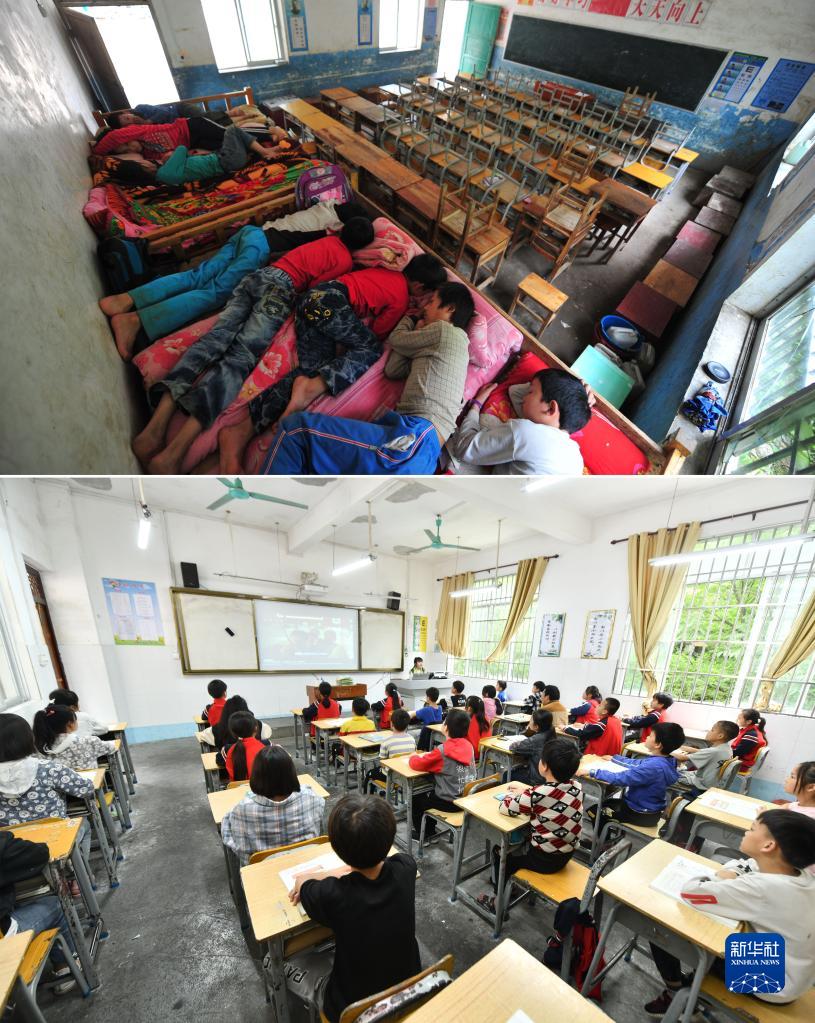上圖:在廣西都安瑤族自治縣隆福鄉漁洞小學(xué),孩子們在教室里睡午覺(jué)。那時(shí)候,教室也是宿舍(2012年5月30日攝);下圖:在漁洞小學(xué),孩子們在寬敞明亮的多媒體教室上課(2022年5月26日攝)。近10年來(lái),學(xué)校修建新的教學(xué)樓、宿舍樓、籃球場(chǎng)、食堂等,辦學(xué)條件得到極大改善。