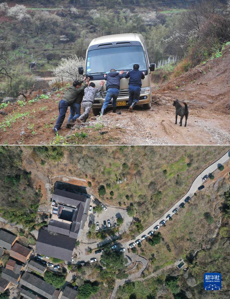 上圖:在廣西融安縣東起鄉崖腳村銅板屯,村民將汽車(chē)推出泥潭(2014年2月22日攝);下圖:汽車(chē)??吭阢~板屯的旅游公路上(2021年2月17日攝,無(wú)人機照片)。銅板屯曾是當地有名的“空心村”,一度只有6位老人留守,整個(gè)村莊瀕臨消逝。10年來(lái),在當地政府的扶持下,返鄉青壯年實(shí)施“故鄉拯救計劃”,發(fā)展生態(tài)觀(guān)光旅游產(chǎn)業(yè)。如今,銅板屯面貌發(fā)生翻天覆地的變化,已成為當地的“網(wǎng)紅村”(拼版照片)。