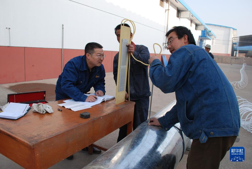 2010年10月16日,在甘肅省蘭州市,付鵬程(左)在保水通風(fēng)設備安裝前現場(chǎng)測試設備參數。