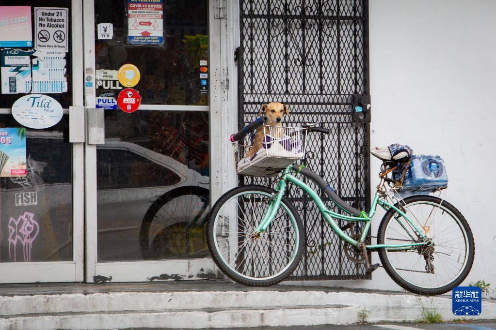 9月27日,在美國佛羅里達州邁阿密,一輛裝載著(zhù)瓶裝水的自行車(chē)停在商店門(mén)前。