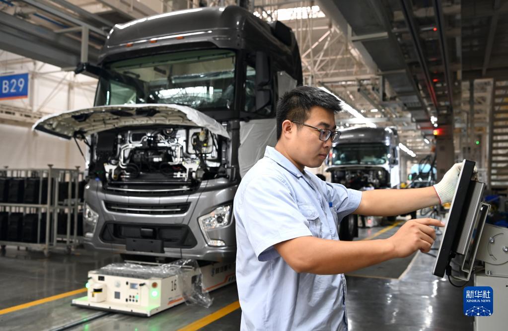工作人員在陜汽重卡擴能項目汽車(chē)總裝生產(chǎn)線(xiàn)上作業(yè)(9月27日攝)。