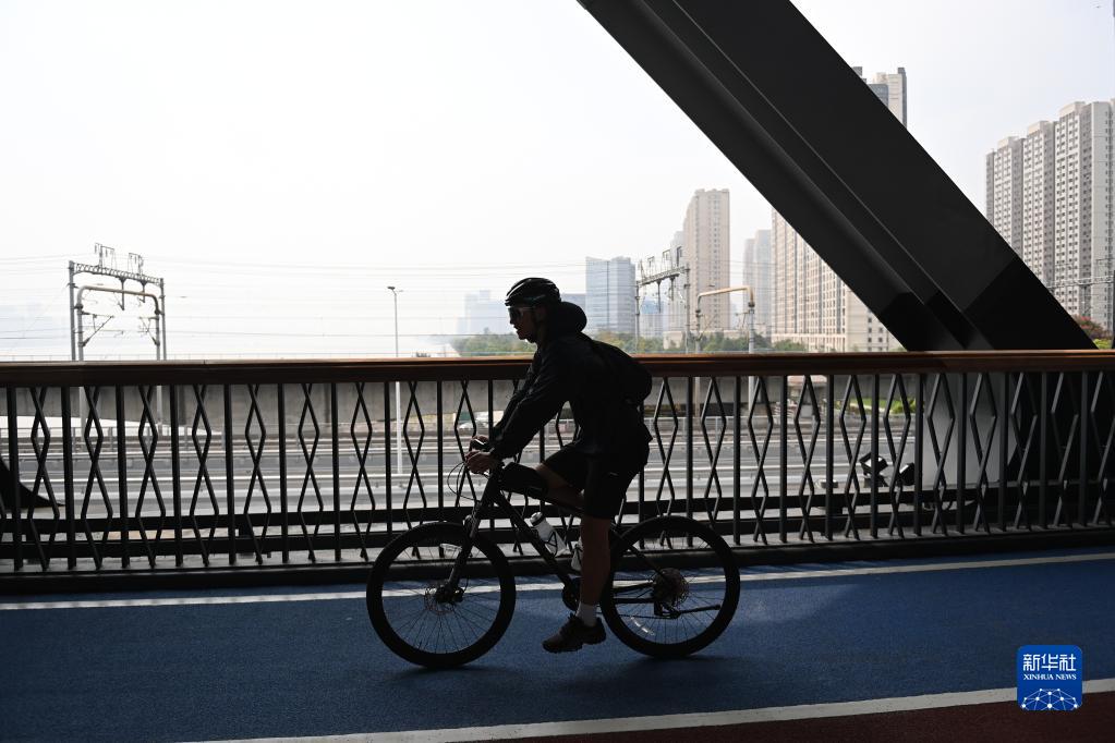 9月28日,市民在新彭埠大橋的慢行系統上騎行。