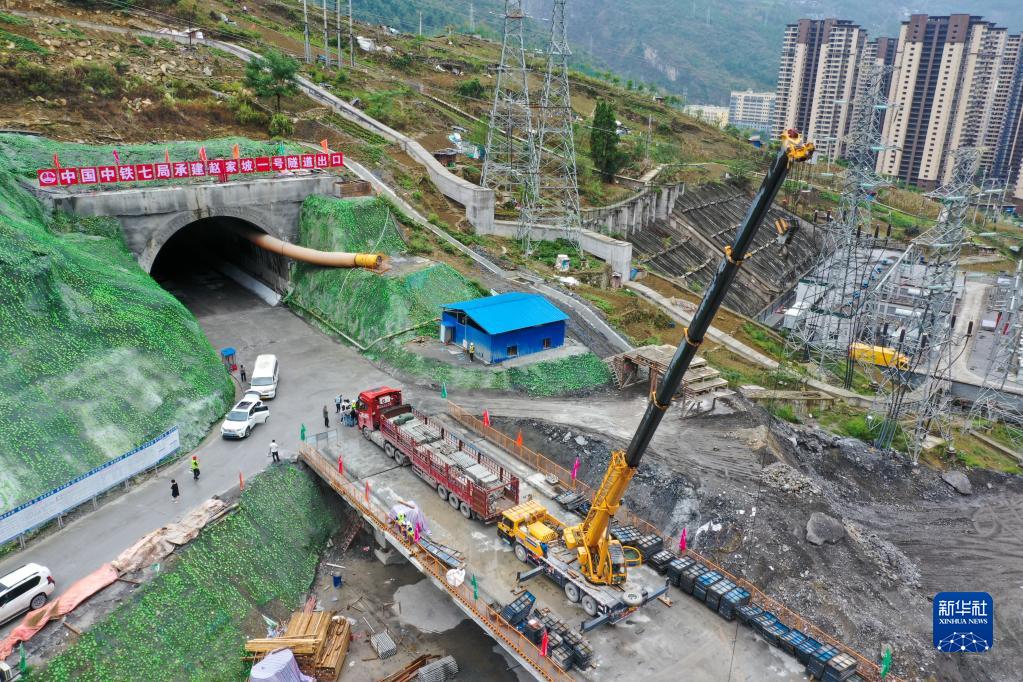 這是9月28日拍攝的渝湘高鐵重慶段趙家坡一號隧道出口施工作業(yè)現場(chǎng)(無(wú)人機照片)。
