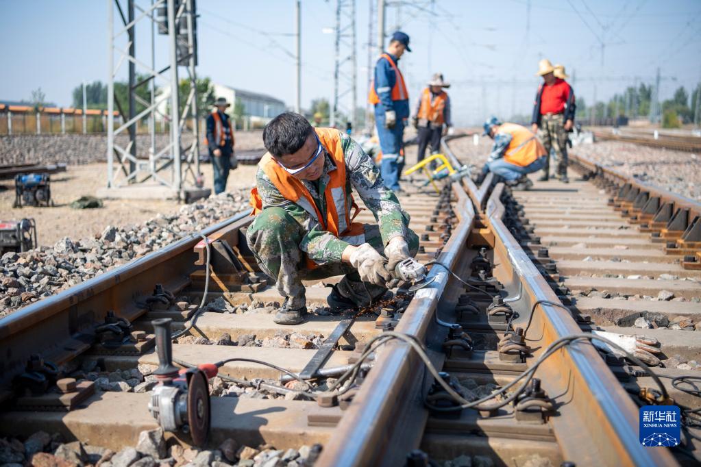 9月28日,中國鐵路太原局集團有限公司大同工務(wù)段工人在大秦線(xiàn)湖東站進(jìn)行施工作業(yè)。