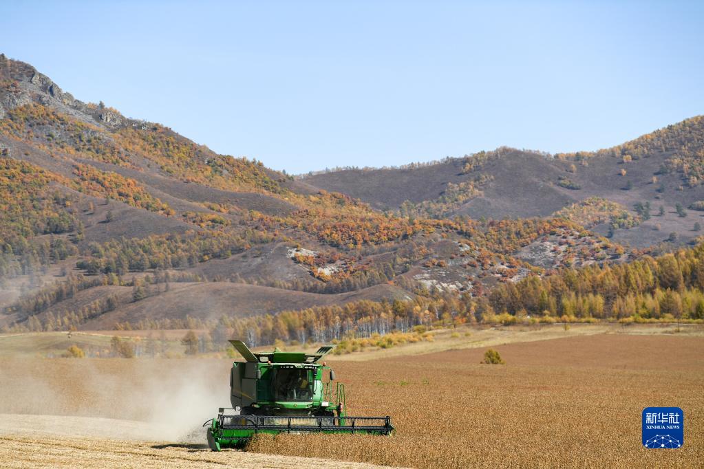9月28日,在呼倫貝爾農墾綽爾河農牧場(chǎng),工作人員駕駛收割機收獲大豆。