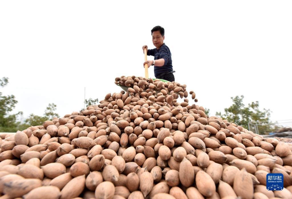 9月28日,在安徽省巢湖市夏閣鎮,農戶(hù)將采摘的薄殼山核桃集中堆放。