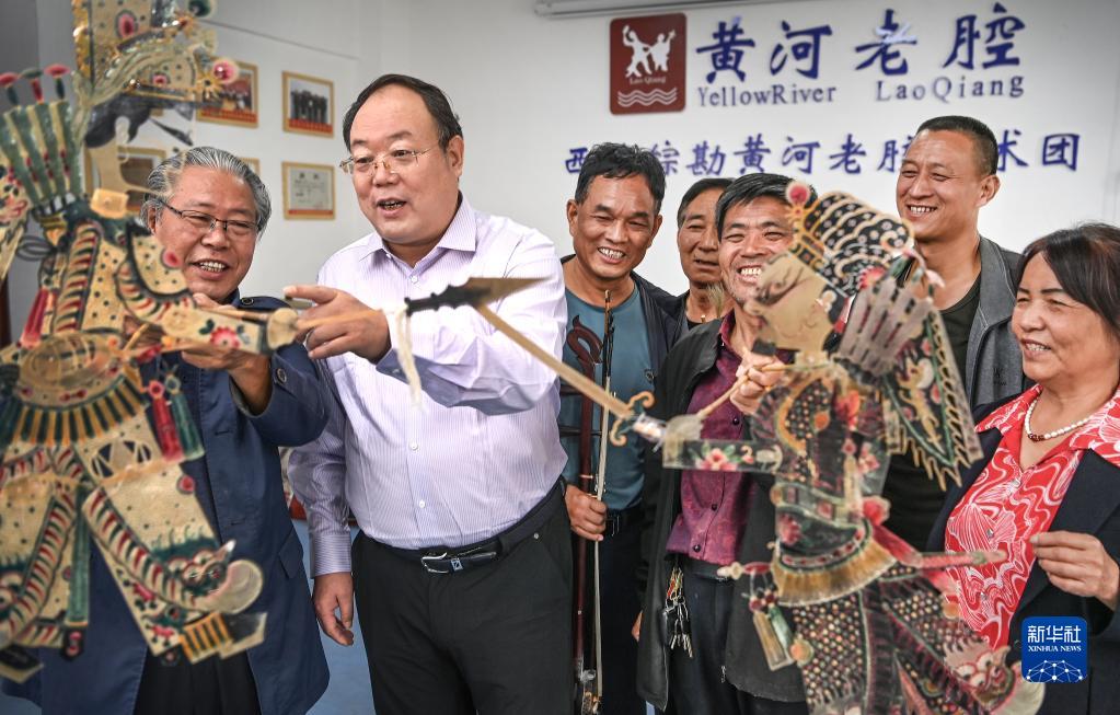 黃河老腔愛(ài)好者燕建龍(左二)與西北綜勘黃河老腔藝術(shù)團藝人一起研究改進(jìn)皮影道具(9月27日攝)。黃河老腔最早用于皮影戲的伴奏,在歷代民間藝人的交流切磋中推陳出新,逐漸脫離皮影戲,成為一門(mén)獨立的表演藝術(shù)。