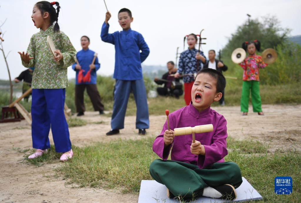 潼關(guān)縣秦東鎮濱河小學(xué)學(xué)生在黃河岸邊練習“黃河老腔”(9月27日攝)。