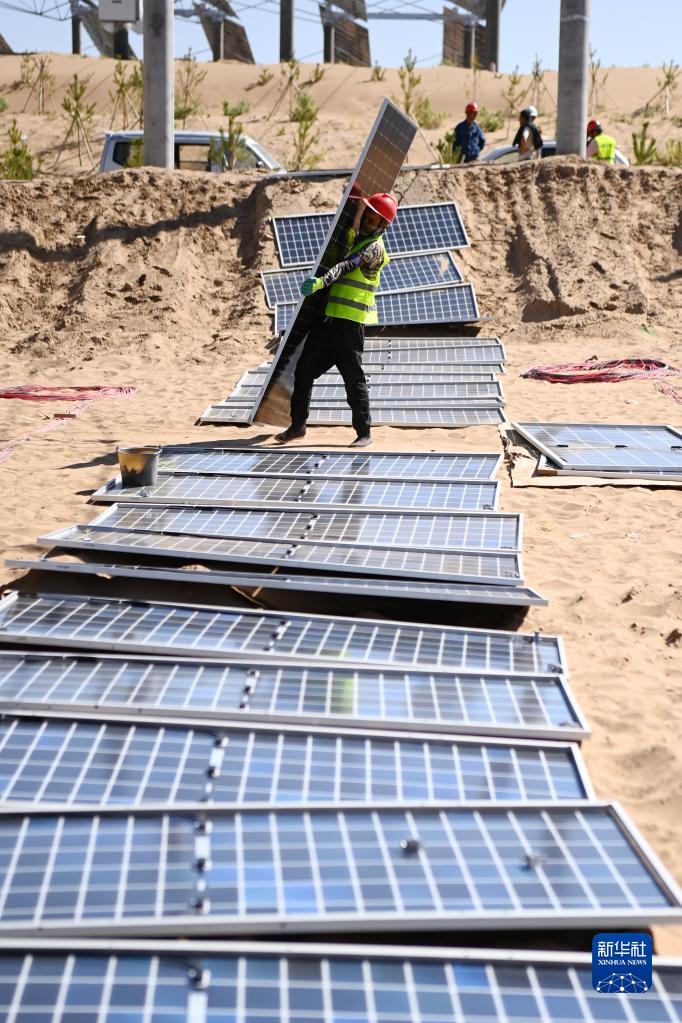 9月29日,在位于甘肅省武威市涼州區的甘肅武威50萬(wàn)千瓦立體光伏治沙產(chǎn)業(yè)化示范項目建設現場(chǎng),施工人員在搬運光伏板。