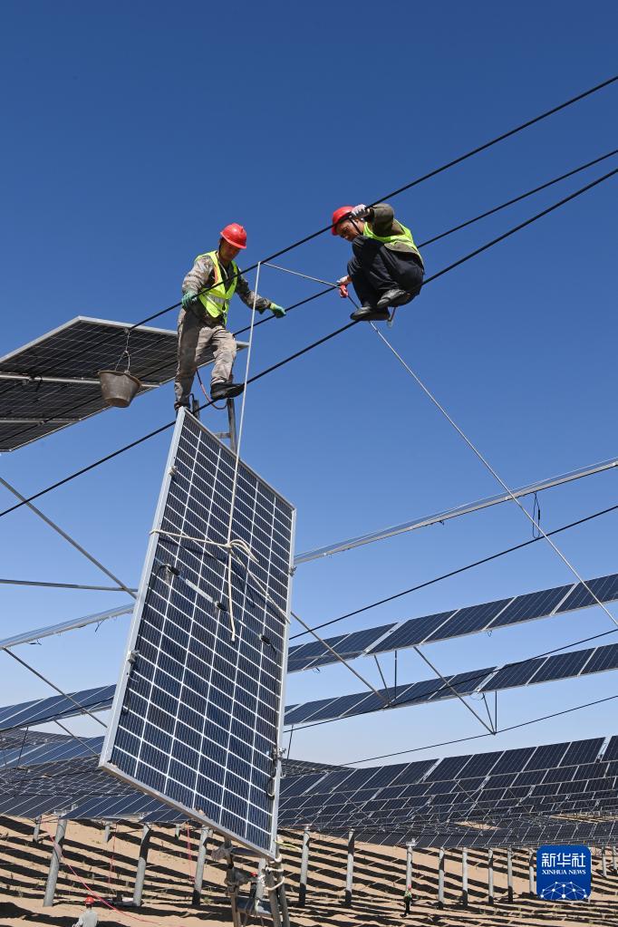9月29日,在位于甘肅省武威市涼州區的甘肅武威50萬(wàn)千瓦立體光伏治沙產(chǎn)業(yè)化示范項目建設現場(chǎng),施工人員在吊裝光伏板。