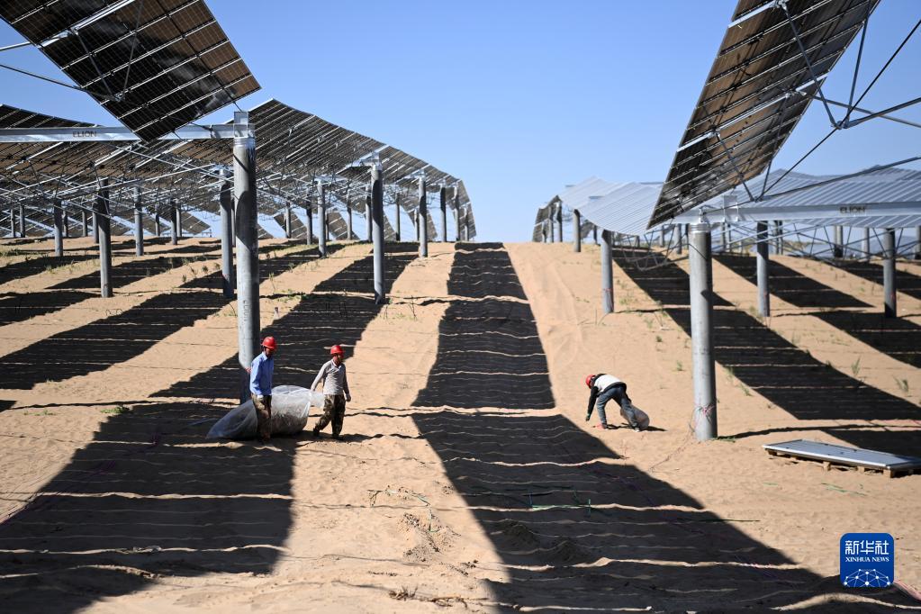 作為我國以沙漠、戈壁、荒漠地區為重點(diǎn)的大型風(fēng)電光伏基地項目,甘肅武威50萬(wàn)千瓦立體光伏治沙產(chǎn)業(yè)化示范項目自啟動(dòng)建設以來(lái),將太陽(yáng)能開(kāi)發(fā)與騰格里沙漠治理有機結合,在建設光伏電站的同時(shí),在光伏板下栽植沙生植物,既能起到防風(fēng)固沙的作用,也為下一步發(fā)展板下農牧業(yè)奠定基礎。目前,該項目建設已接近尾聲,預計今年年底建成并網(wǎng)發(fā)電。