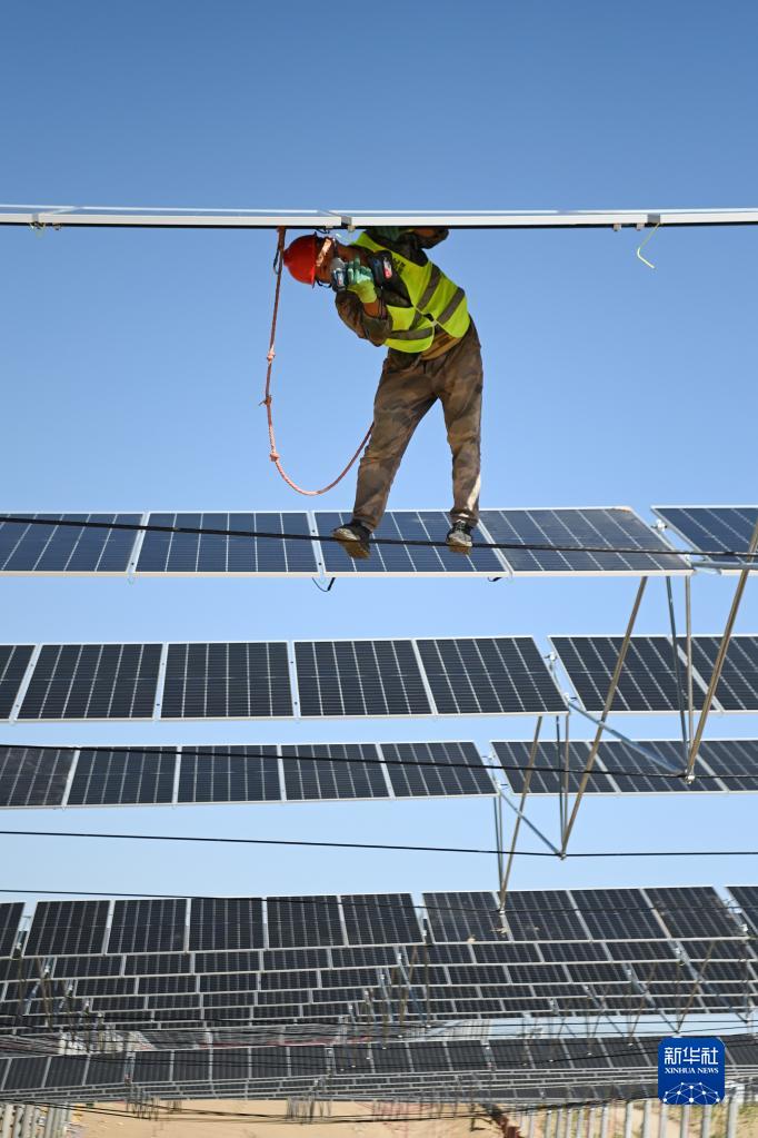 9月29日,在位于甘肅省武威市涼州區的甘肅武威50萬(wàn)千瓦立體光伏治沙產(chǎn)業(yè)化示范項目建設現場(chǎng),施工人員在安裝光伏板。