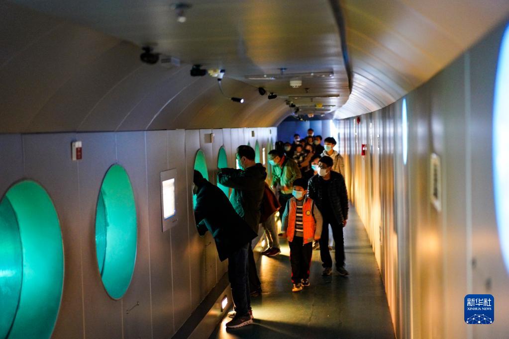 游客在重慶白鶴梁水下博物館的水下參觀(guān)廊道內,通過(guò)觀(guān)景窗觀(guān)看保護罩內的白鶴梁題刻(2021年2月21日攝)。