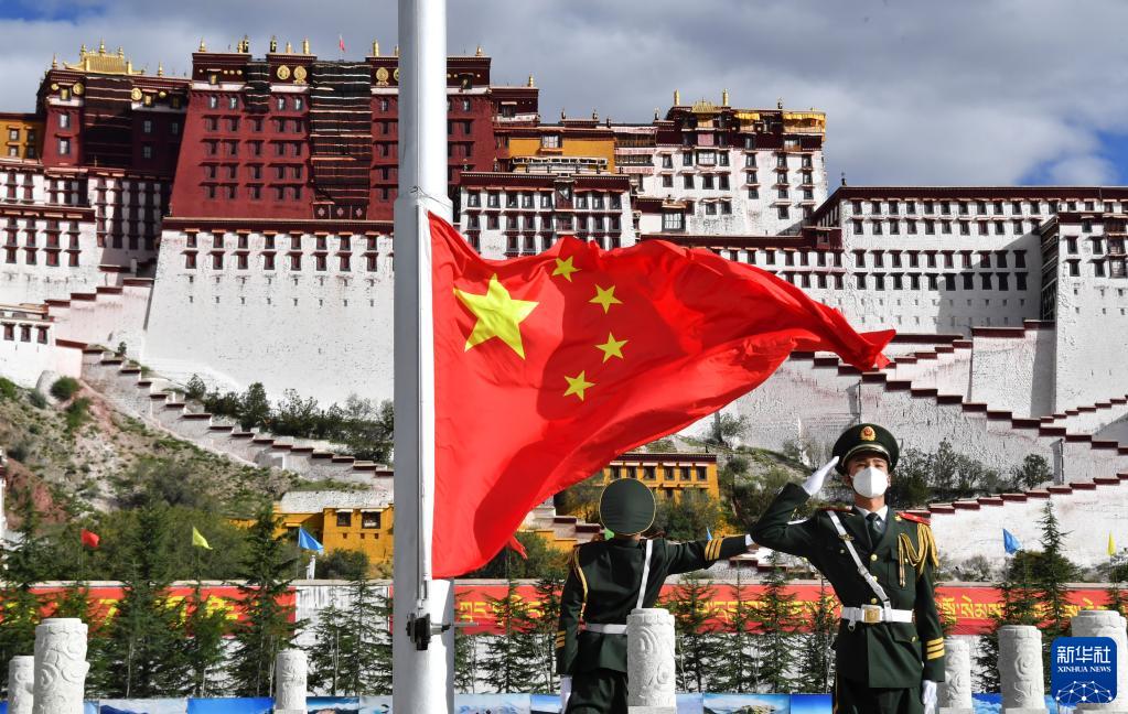 10月1日在拉薩布達拉宮廣場(chǎng)拍攝的升國旗儀式。