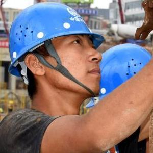 10月1日,在青島國際郵輪母港區啟動(dòng)區地下空間項目工地,中鐵四局的架工班工人姜虎(右)與工友在工地上勞動(dòng)。