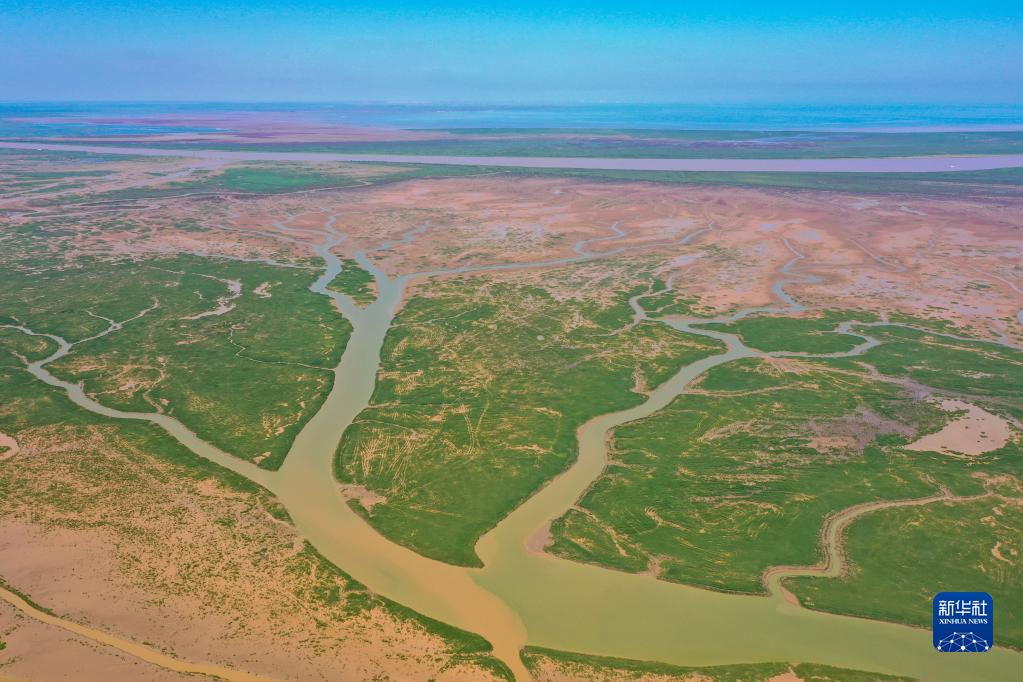 這是在山東黃河三角洲國家級自然保護區拍攝的黃河入??跐竦仫L(fēng)光(8月17日攝,無(wú)人機照片)。