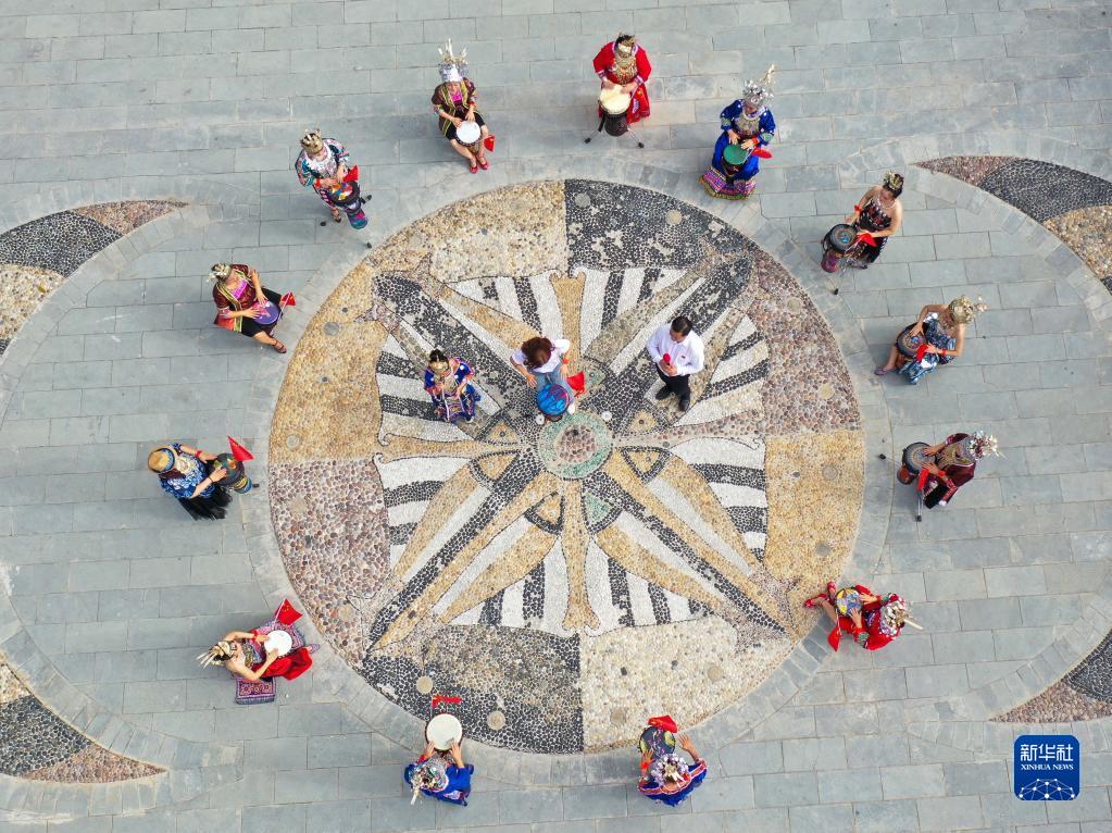 10月1日,表演者在貴州省銅仁市玉屏侗族自治縣皂角坪街道紫氣山社區擊鼓慶國慶(無(wú)人機照片)。