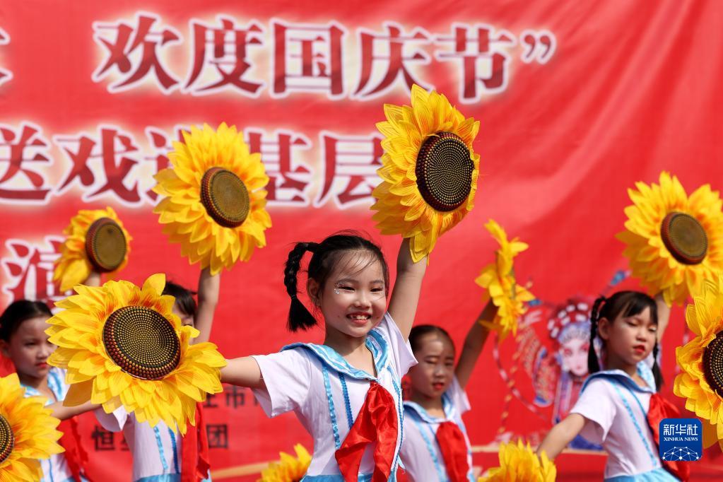 10月1日,在山東省棗莊市光明路街道周莊社區,小朋友表演節目。