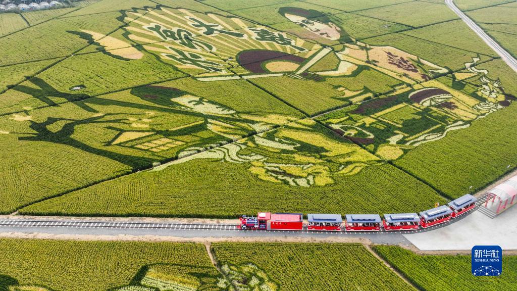 10月1日,游客乘坐小火車(chē)在河北省遵化市團瓢莊鄉山里各莊村稻田畫(huà)景區賞景(無(wú)人機照片)。
