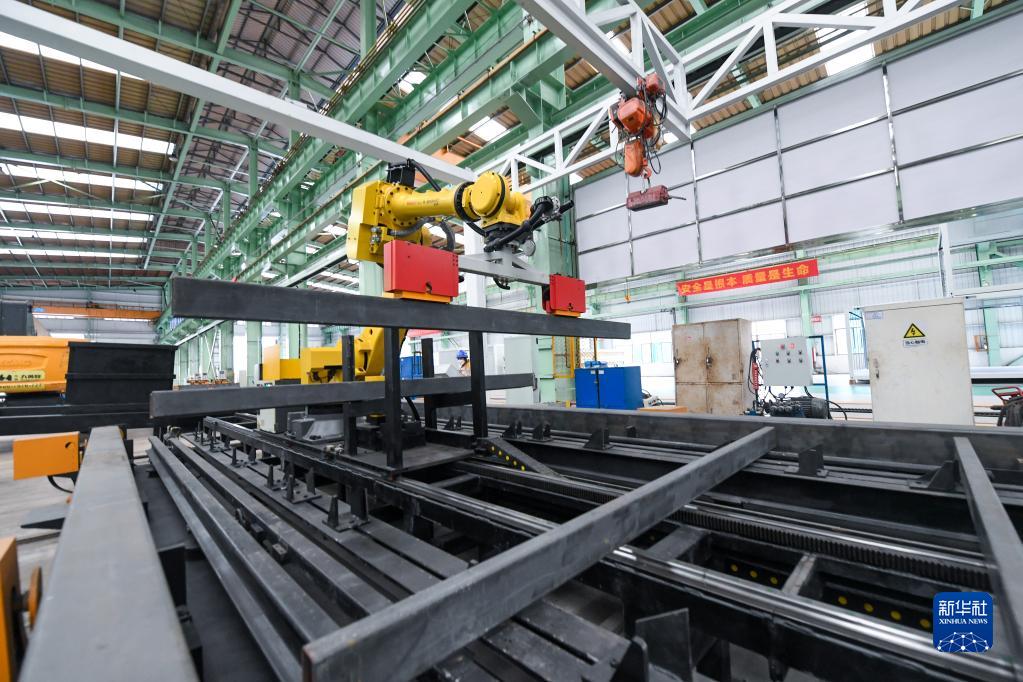 在智能化鋼結構模塊化生產(chǎn)線(xiàn)上,機械臂在裝配鋼結構模塊(2022年9月28日攝)。