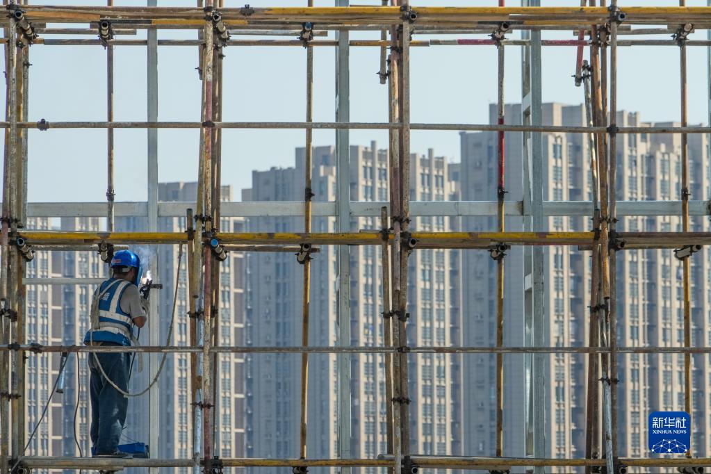 10月2日,中建三局一公司的施工人員在南京市建鄴區小米集團華東總部項目施工現場(chǎng)作業(yè)。