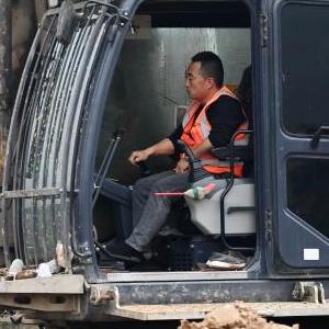 10月2日,中鐵上海工程局施工人員在位于陜西省西安市的西十高鐵浐河特大橋操作旋轉挖機(無(wú)人機照片)。