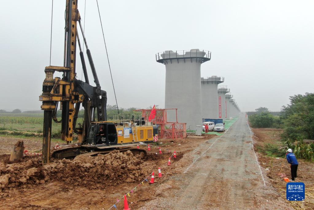 10月2日,中鐵上海工程局施工人員在位于陜西省西安市的西十高鐵浐河特大橋操作旋轉挖機(無(wú)人機照片)。