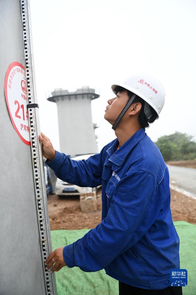 10月2日,中鐵上海工程局施工人員在位于陜西省西安市的西十高鐵浐河特大橋開(kāi)展測量作業(yè)。