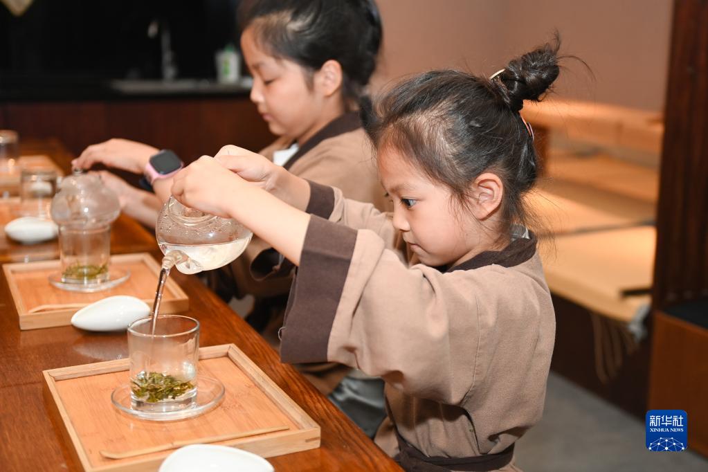10月2日,小朋友在杭州青少年發(fā)展中心“Do都城”體驗“茶藝師”。