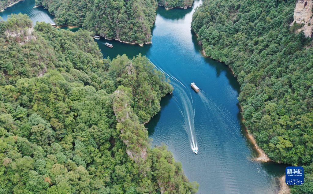 10月2日,游客在湖南張家界市武陵源區寶峰湖景區乘船游覽。