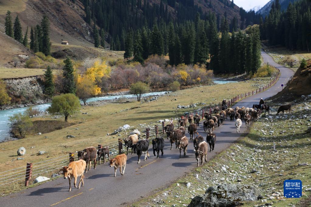 進(jìn)入10月,新疆伊犁哈薩克自治州昭蘇縣夏特柯?tīng)柨俗巫遴l闊斯托別村牧民趕著(zhù)褐牛走出夏塔大峽谷。連日來(lái),隨著(zhù)氣溫降低,昭蘇縣各族牧民紛紛將山區峽谷里的褐牛趕往平原田野放養。